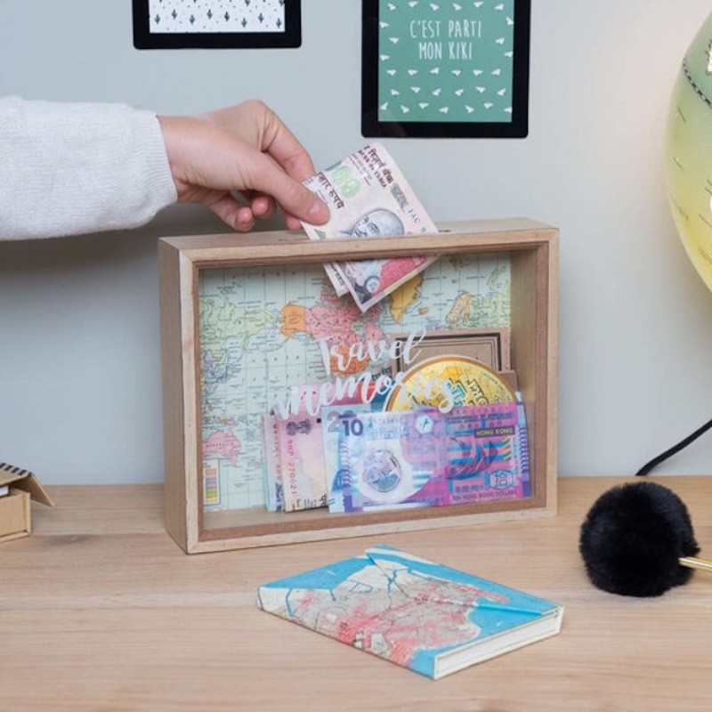 Cette boîte permet de prolonger votre voyage en conservant tous vos meilleurs souvenirs : billets d'avion, monnaies étrangères, entrées de musées, cartes de visite...