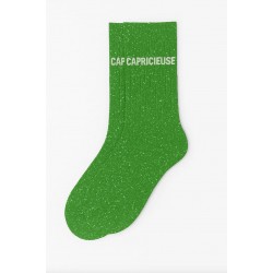 Charmantes chaussettes WOOM "Capricieuse" coloris Matcha, à paillettes et à message, parfaites pour ajouter une touche d'humour et de style à vote look.