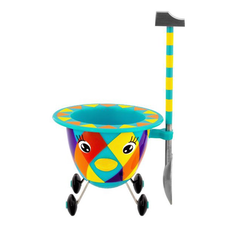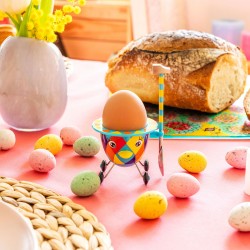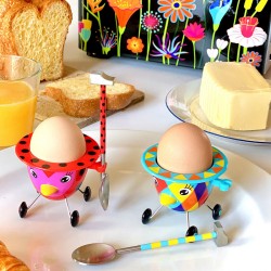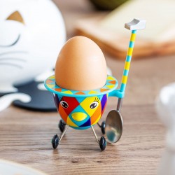 Ce coquetier original et coloré est conçu pour apporter une touche de fantaisie à votre table. Doté de 4 petites roues et accompagné d'une cuillère et d'un marteau, il permet de casser la coquille de l'oeuf avec amusement avant de le déguster.