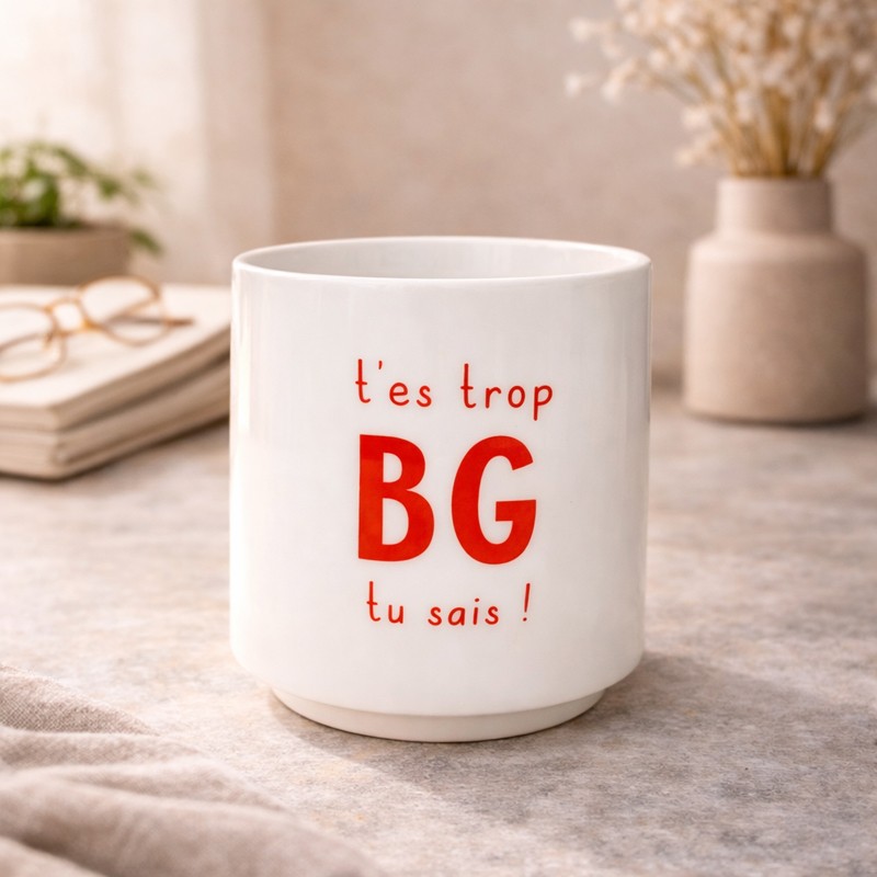Son inscription"T'es trop BG tu sais !" apporte une dose de confiance et de sourire dès le matin. Idéal pour offrir ou se faire plaisir, ce mug allie élégance et originalité.
