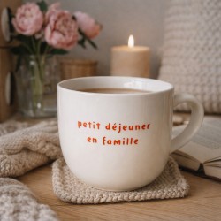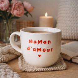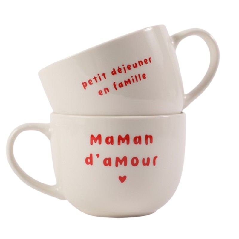 D'un côté, l'inscription "Maman d'amour" célèbre la tendresse et l'affection du quotidien, tandis que de l'autre, "Petit déjeuner en famille" rappelle les instants chaleureux partagés autour de la table.