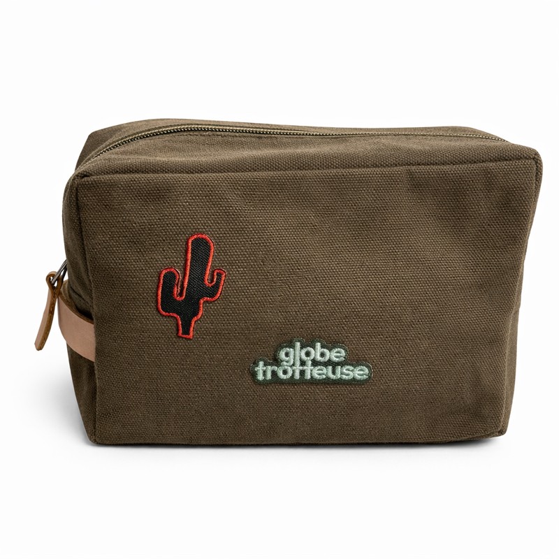Confectionnée dans une jolie toile couleur kaki, elle se distingue par ses 2 patchs décoratifs (cactus & Globe-trotteuse) qui lui apportent une touche originale et tendance.