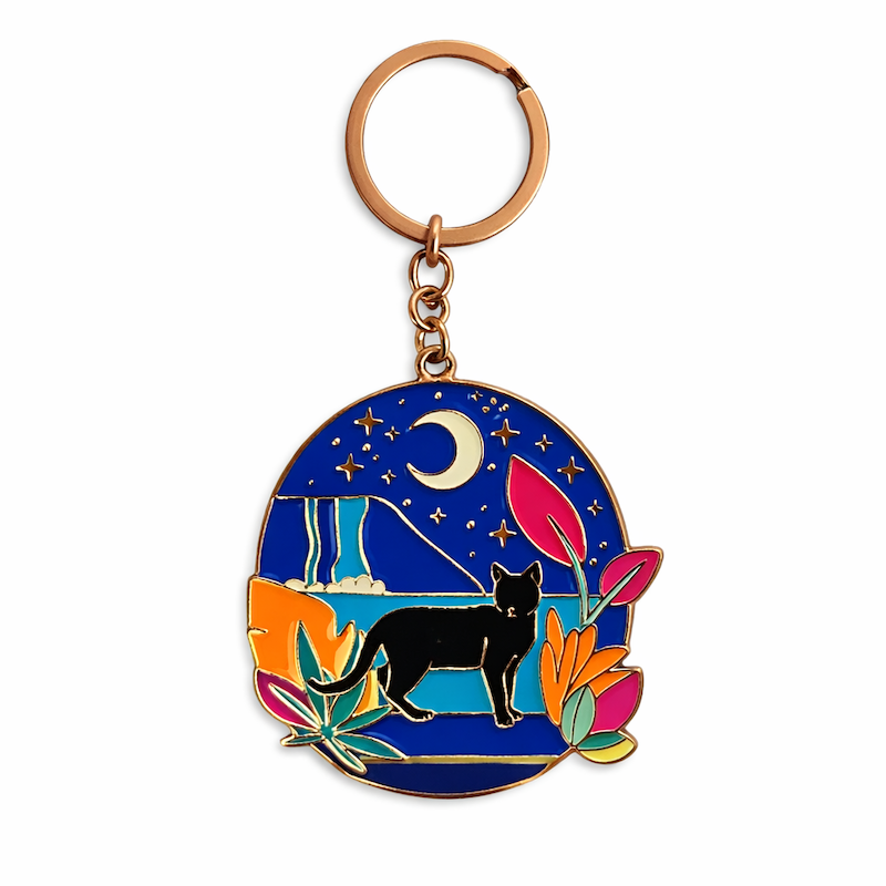 Plongez dans une ambiance nocturne pleine de magie. Ce porte-clés en métal représentant un chat dans un paysage sous la lune séduit par ses couleurs profondes et son univers onirique.