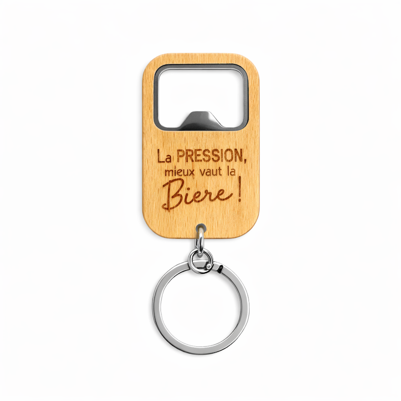 Ce porte-clés décapsuleur en bois gravé “La pression, mieux vaut la boire !” est l’accessoire parfait pour allier humour et praticité. Idéal pour détendre l’atmosphère, il accompagne son propriétaire partout… et surtout lors des moments conviviaux.