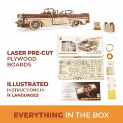 Découvrez la Dream Cabriolet VM-05 Ugears, une maquette en bois élégante à assembler soi-même. Composée de plus de 700 pièces, elle fonctionne sans colle et dévoile un mécanisme sophistiqué.