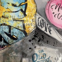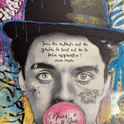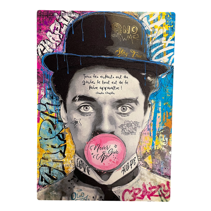 Découvrez ce tableau original de l’artiste Romaric, rendant hommage à l’iconique Charlie Chaplin dans un style urbain et résolument contemporain. Cette œuvre unique revisite ce personnage mythique à travers un univers street art, mêlant couleurs vives, collages graphiques et messages inspirants.