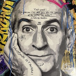 Découvrez ce tableau original de l’artiste Romaric, rendant hommage à l’inoubliable Louis de Funès dans une version résolument moderne et décalée. Cette œuvre revisite avec humour et énergie cette icône du cinéma français à travers un univers street art riche en couleurs, en typographies et en détails percutants.