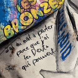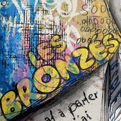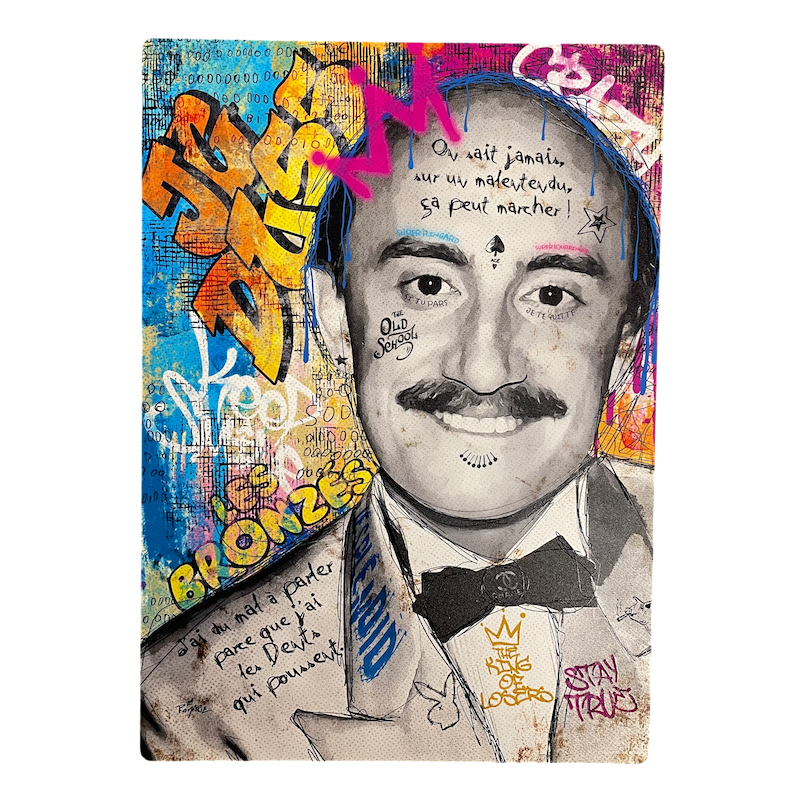 Découvrez ce tableau original de l’artiste Romaric, inspiré de l’univers de Michel Blanc, revisité dans un style street art moderne et expressif. Cette œuvre se distingue par la richesse de ses détails graphiques, mêlant citations, typographies, motifs et jeux de textures qui captent immédiatement le regard.