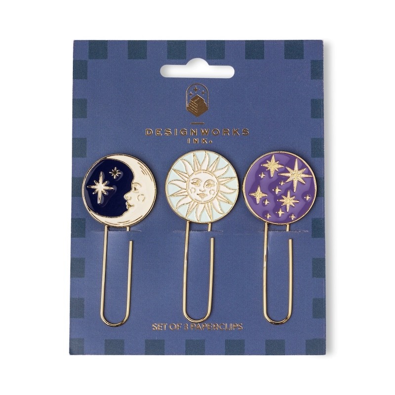 Apportez une touche poétique à votre bureau avec ce set de 3 trombones décoratifs aux motifs lune, soleil et étoiles. À la fois pratiques et esthétiques, ils subliment vos documents du quotidien.