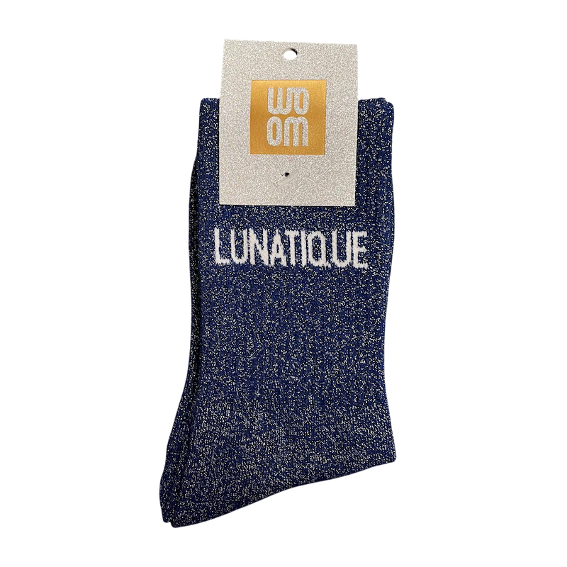 Les chaussettes à paillettes LUNATIQUE de WOOM sont parfaites pour celles qui assument toutes leurs facettes avec humour. Leur message décalé et leur bleu profond scintillant apportent une touche originale et pleine de personnalité à votre tenue.
