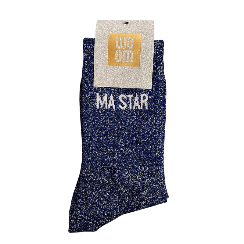 Les chaussettes à paillettes MA STAR de WOOM mettent en lumière votre personnalité avec un message valorisant et plein de style. Leur bleu profond scintillant et leurs paillettes élégantes apportent une touche chic et lumineuse à toutes vos tenues.