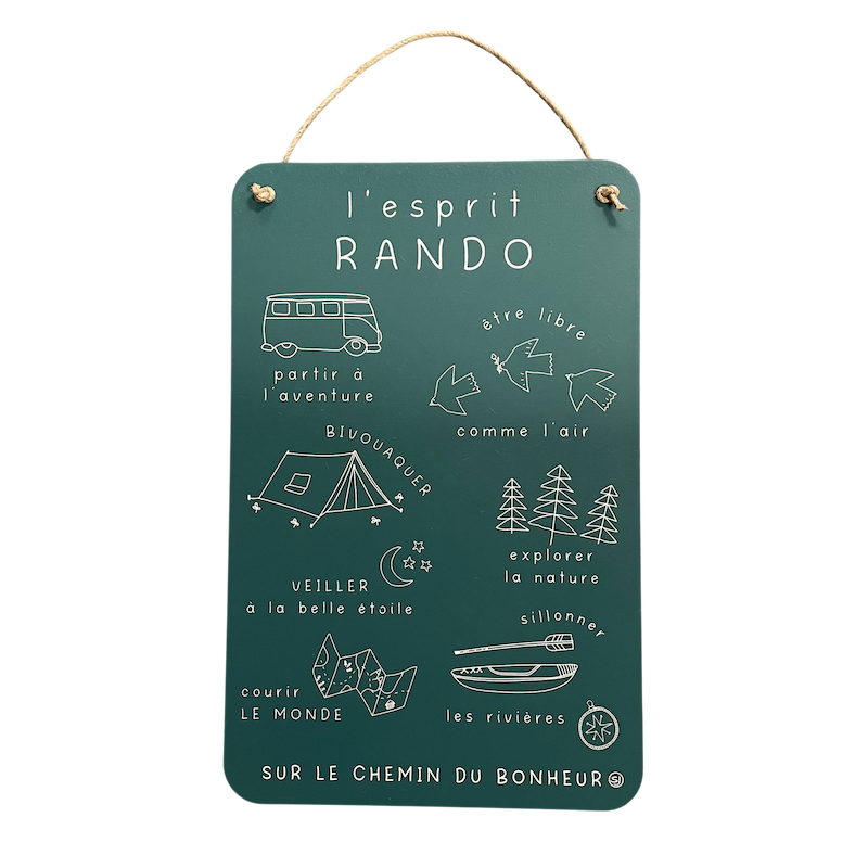 La plaque à suspendre “Esprit Rando” évoque la liberté, l’évasion et le goût de l’aventure. À travers ses illustrations délicates et ses mots inspirants, elle célèbre les plaisirs simples : explorer, respirer, bivouaquer et suivre son propre chemin.