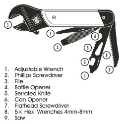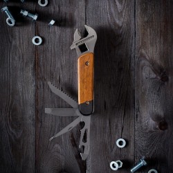 Derrière son design soigné avec manche en bois se cachent 9 fonctions indispensables : clé à molette, tournevis, lime, décapsuleur, couteau cranté, ouvre-boîte, clés hexagonales et scie.